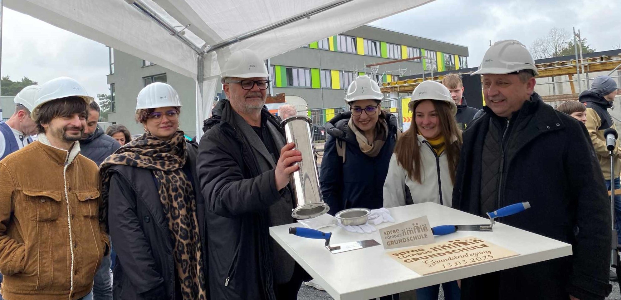 Spreecampus Fürstenwalde März 2025 - Am 13.3.2025 wurde die Grundsteinlegung für den Neubau der Grundschule des Spree-Campus Fürstenwalde gefeiert. Der Holz-Beton-Hybridbau wächst in die Höhe, die ersten Wände stehen bereits. |