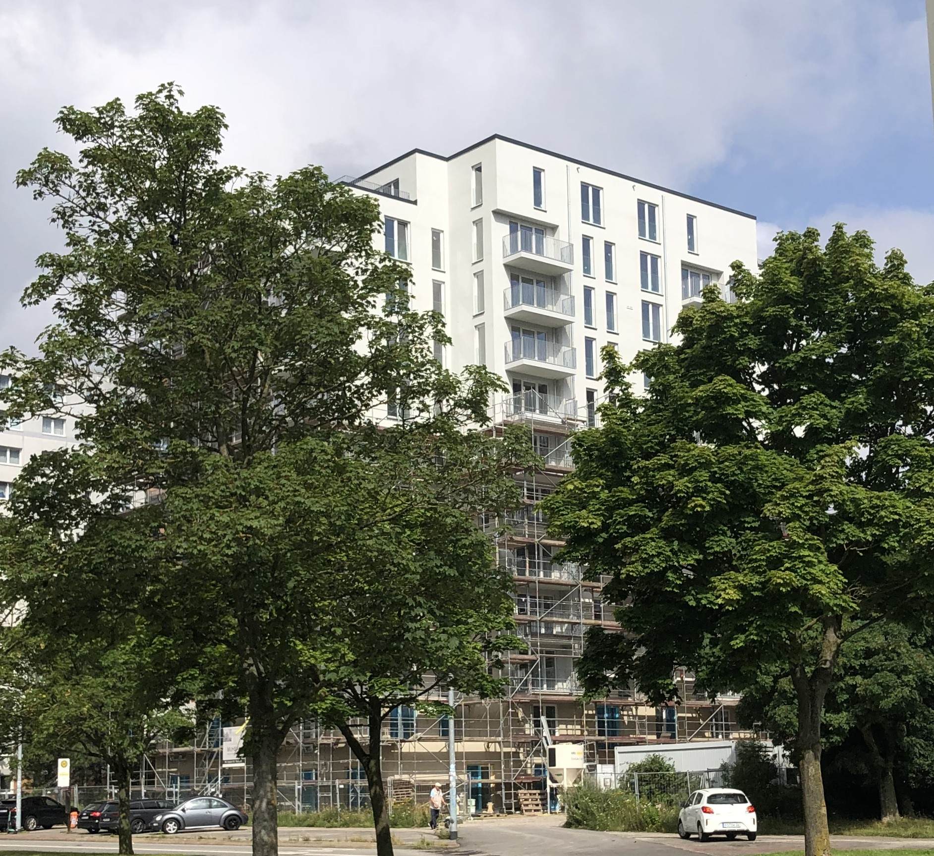 Warnowallee, Rostock 07 2024 - Die Rüstung wird abgebaut und der 11-geschossige Bau zeigt sein "Gesicht". Damit rückt der Termin der Nutzungsaufnahme für die 56 geförderten Wohnungen, die 4 freifinanzierten Wohneinheiten und die beiden Wohngruppen in den unteren Geschossen näher. |