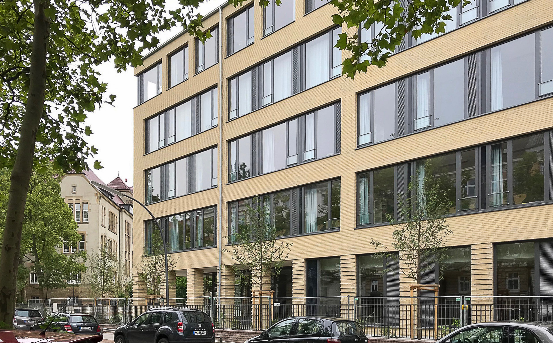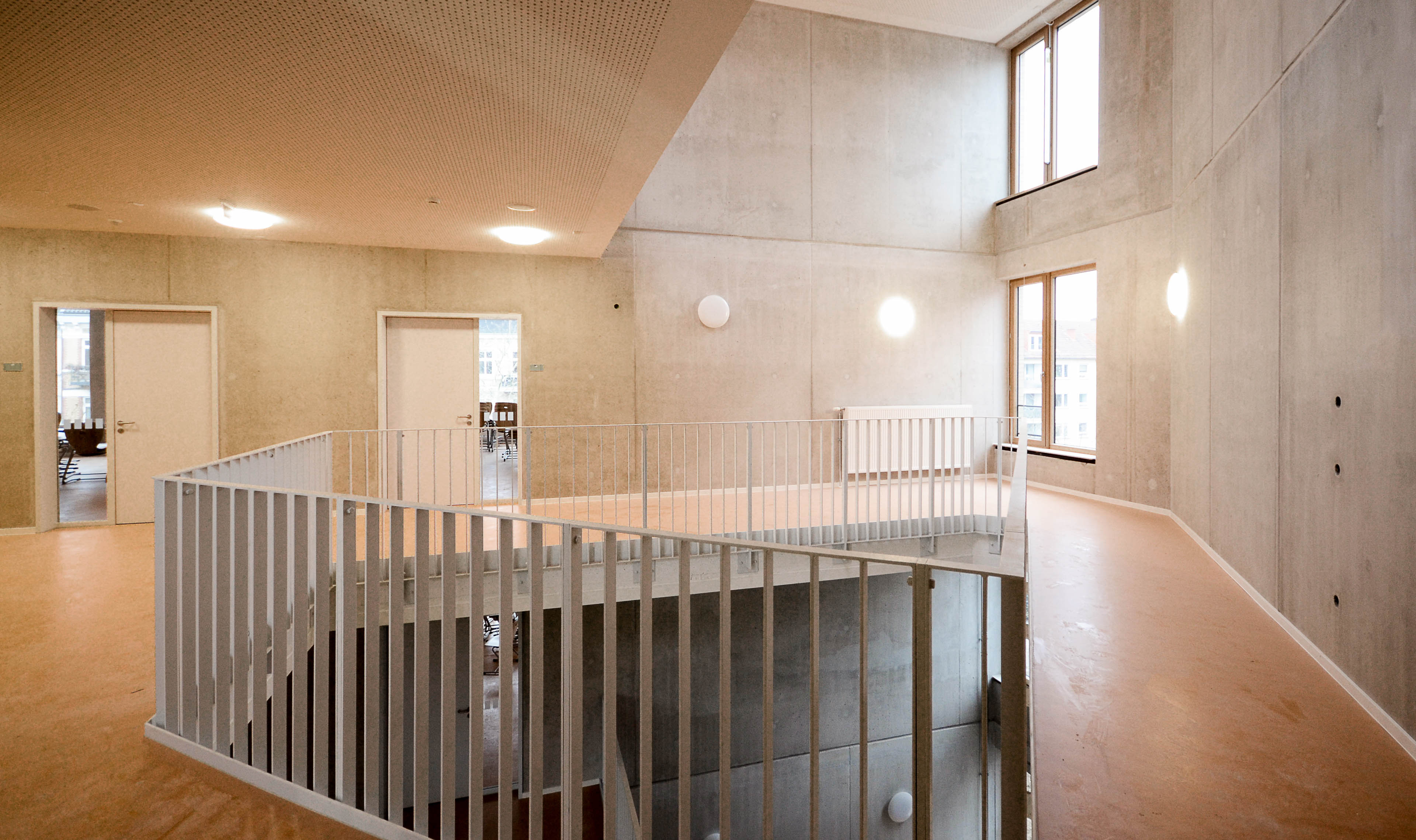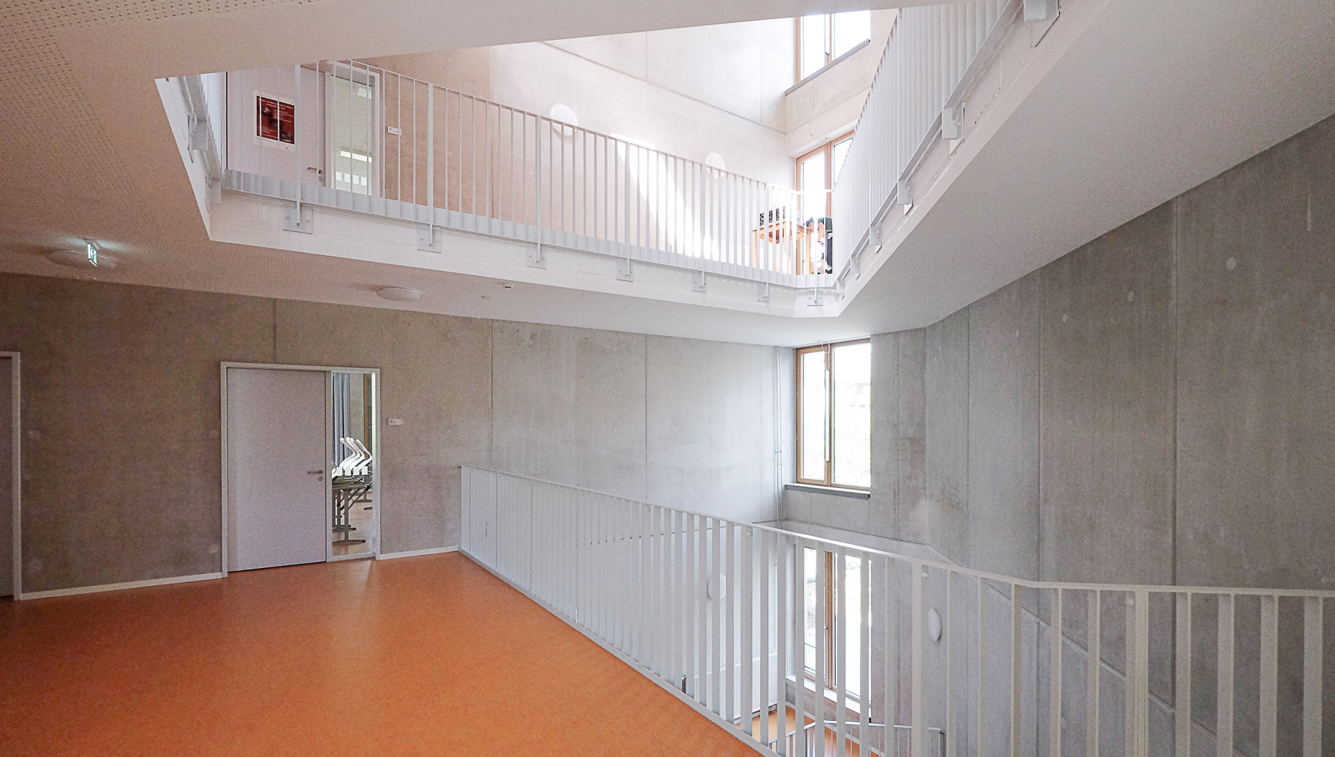 Angrenzend an den Erweierungsbau aus den 90er Jahren wurde ein 5.geschossiges Gebäude mit einer Sporthalle im Untergeschoss errichtet. Über ein zentrales, offenes Treppenhaus wird der Neubau mit dem Bestandbau verbunden.