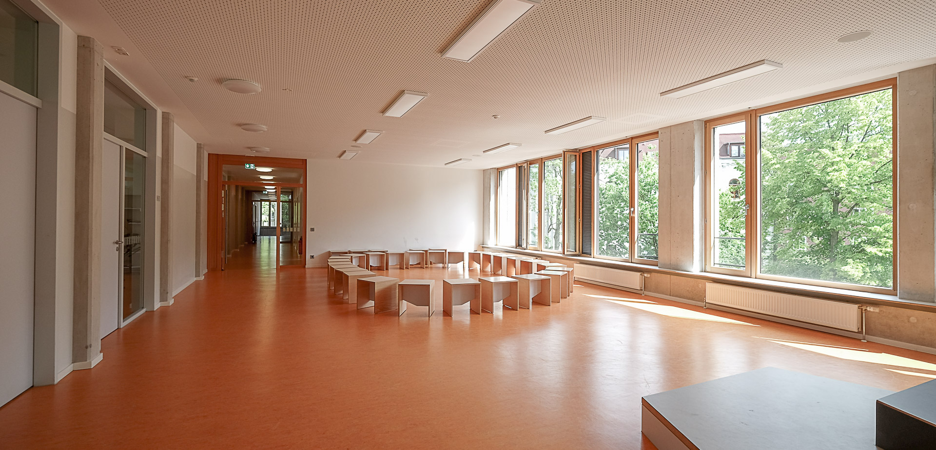 Für die Jahrgangsstufen 1 bis 4 wurden Klassenräume und jahrgangsbezogene Multifunktionsflächen mit jeweils einem Lehrerstützpunkt geschaffen.