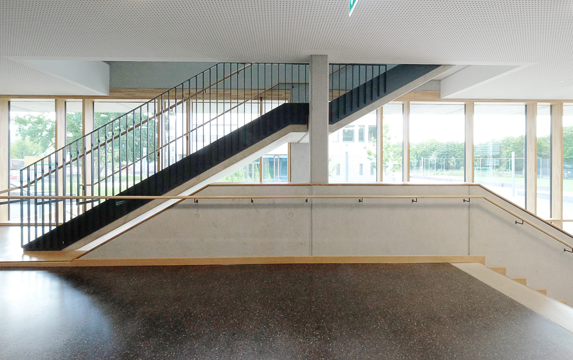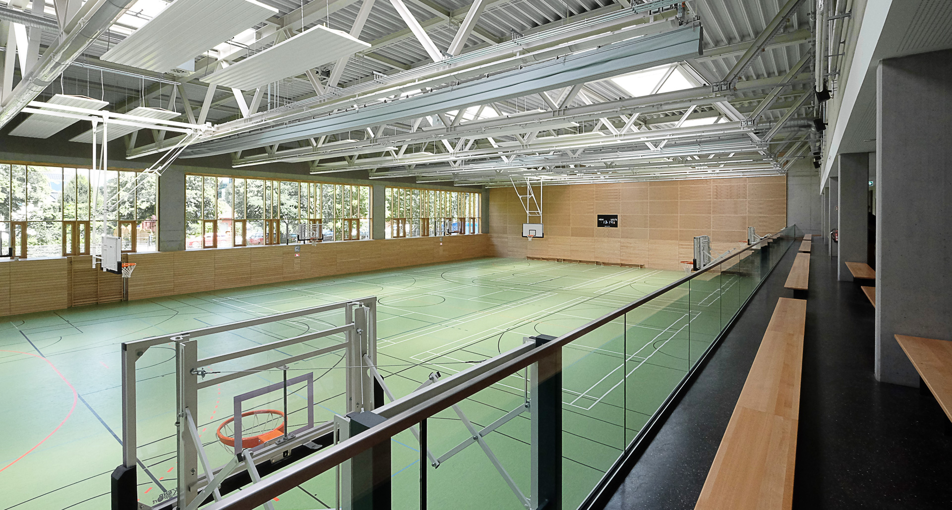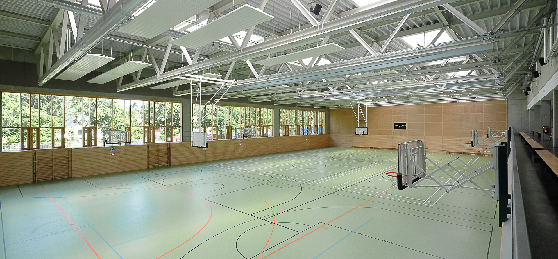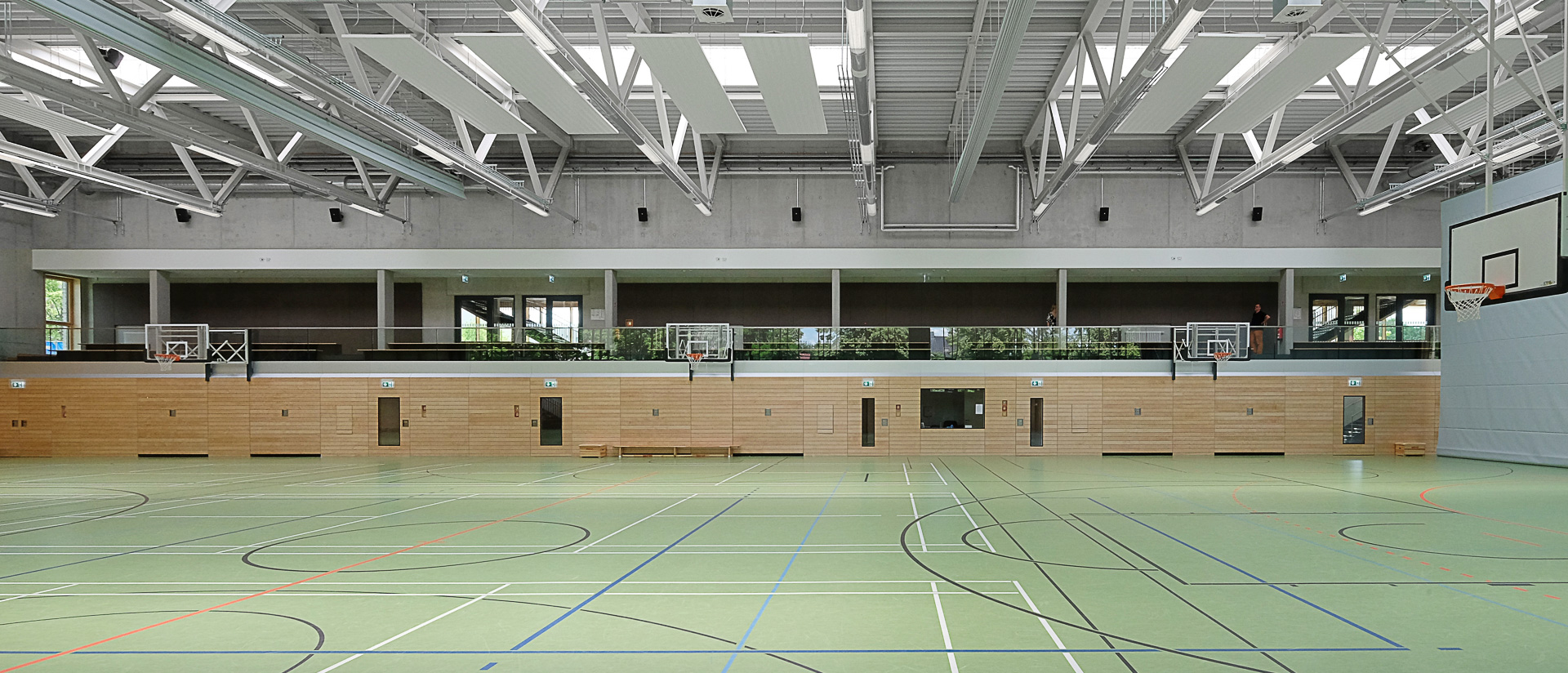 Die Sporthalle bildet den nördlichen Abschluss des zentralen Schulforums. Sie wurde als 4-Feld-Halle mit einer Hallenfläche von 27m x 60 m errichtet.